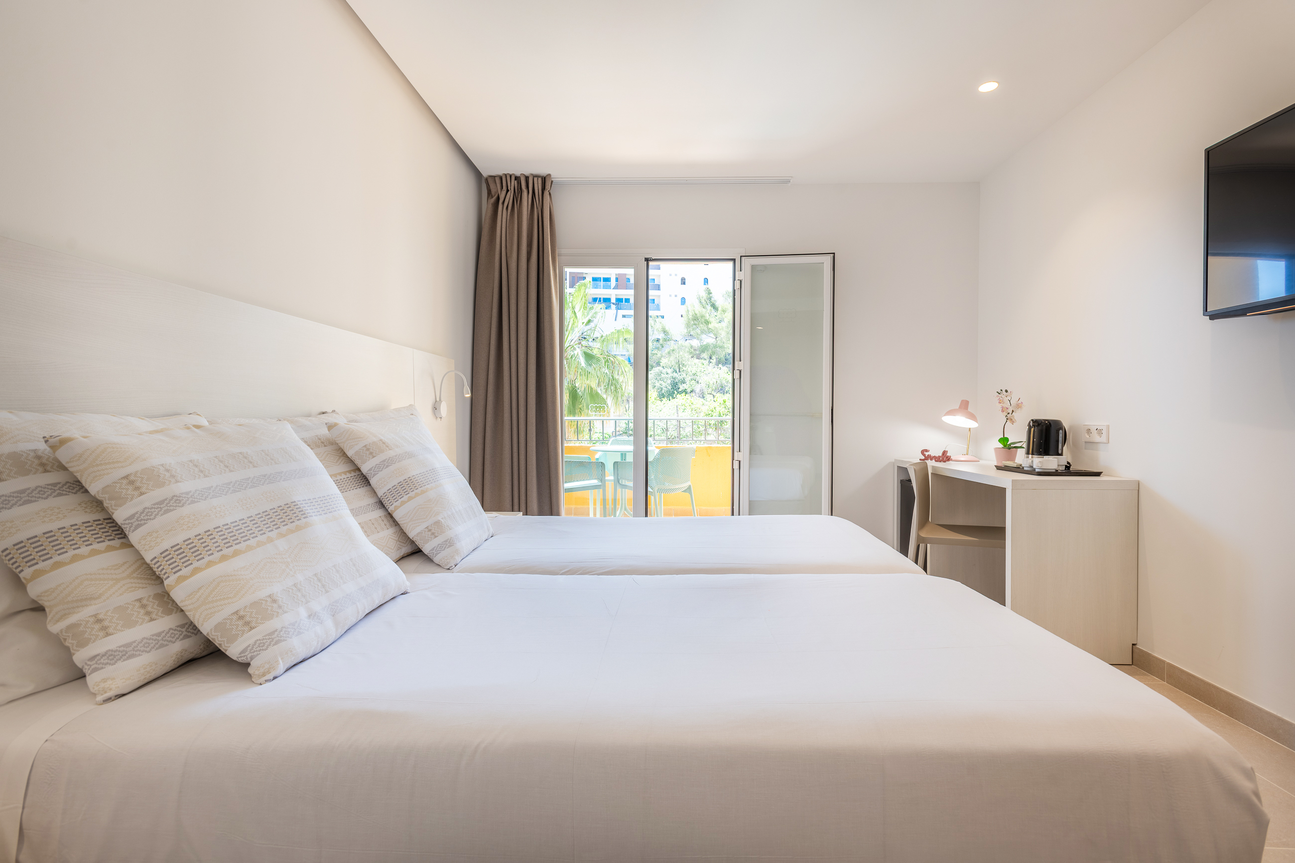 Zimmer für zwei Personen mit Balkon, einem Doppelbett (180 cm x 190 cm) oder zwei Einzelbetten (90 cm x 190 cm), TV und eigenem Bad mit Dusche oder Badewanne. Klimaanlage, Safe, Kühlschrank und kostenfreies WLAN inklusive. Tägliche Reinigung.