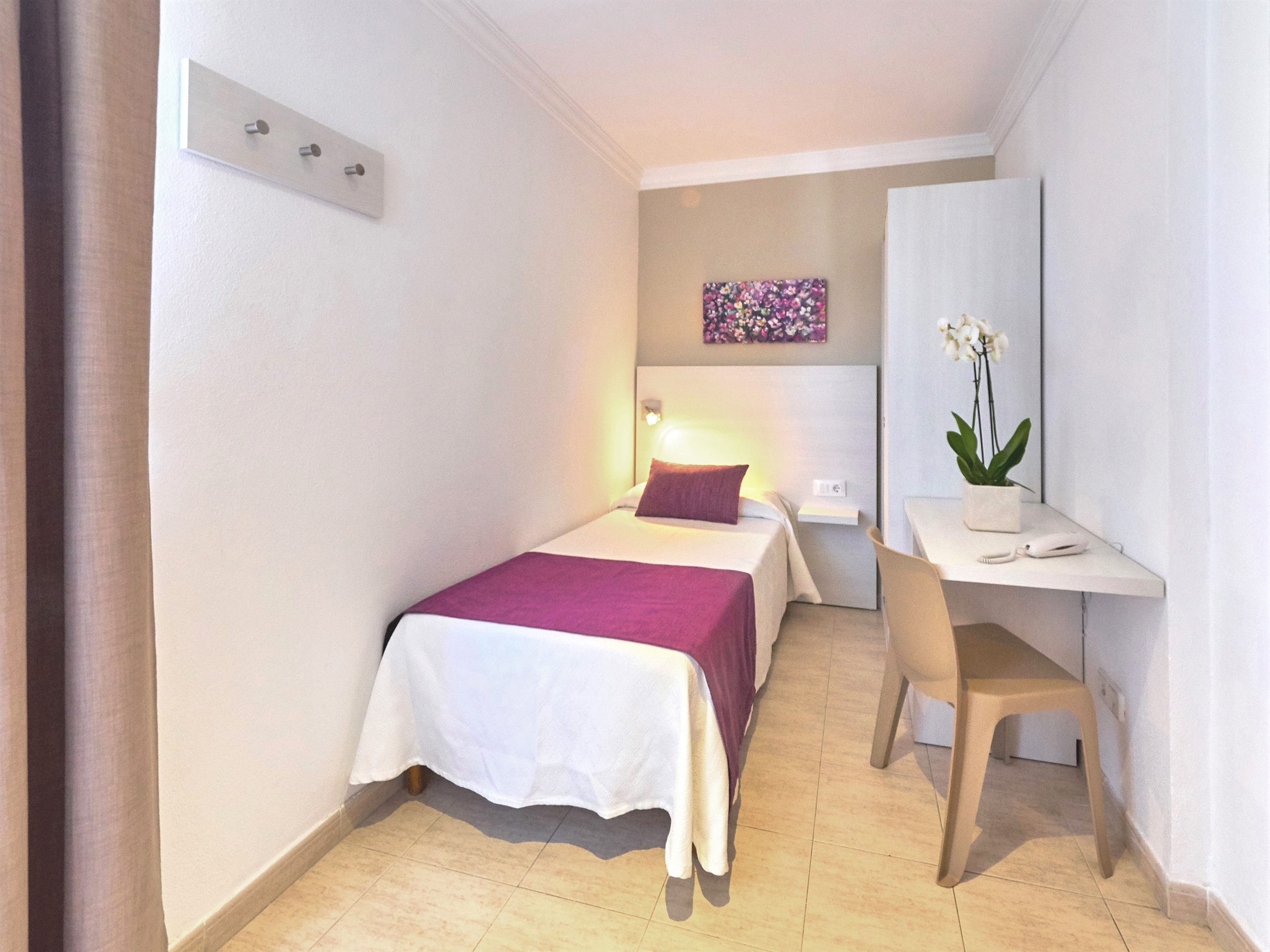 Habitación para una persona con balcón, una cama individual (90cm x 190cm o 130cm x 190cm), TV y baño privado con ducha o bañera. Climatización, caja fuerte, nevera y wifi gratuito incluido. Limpieza diaria.
